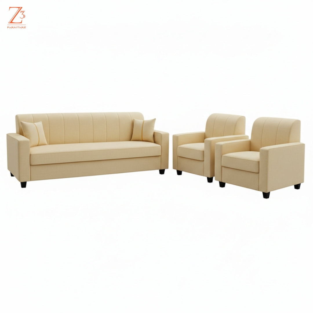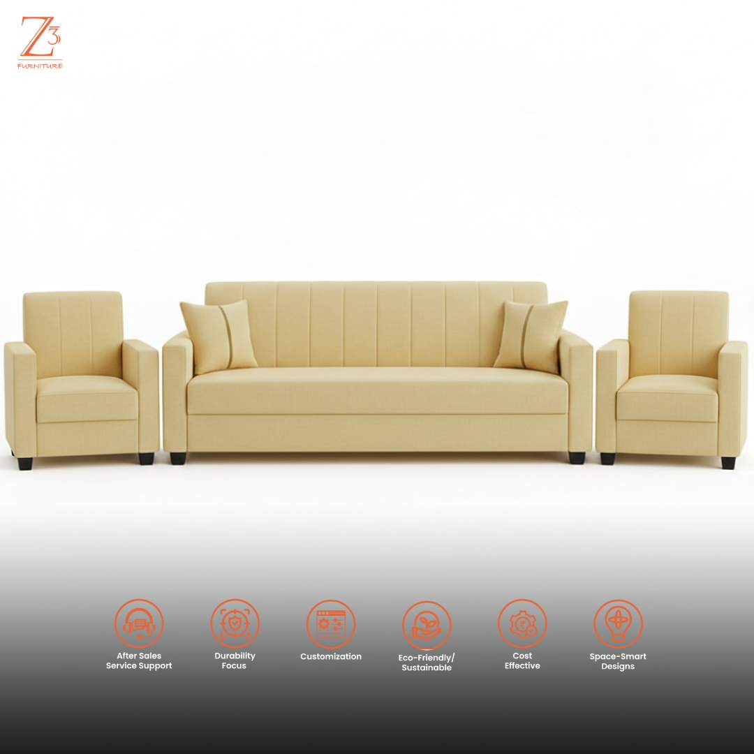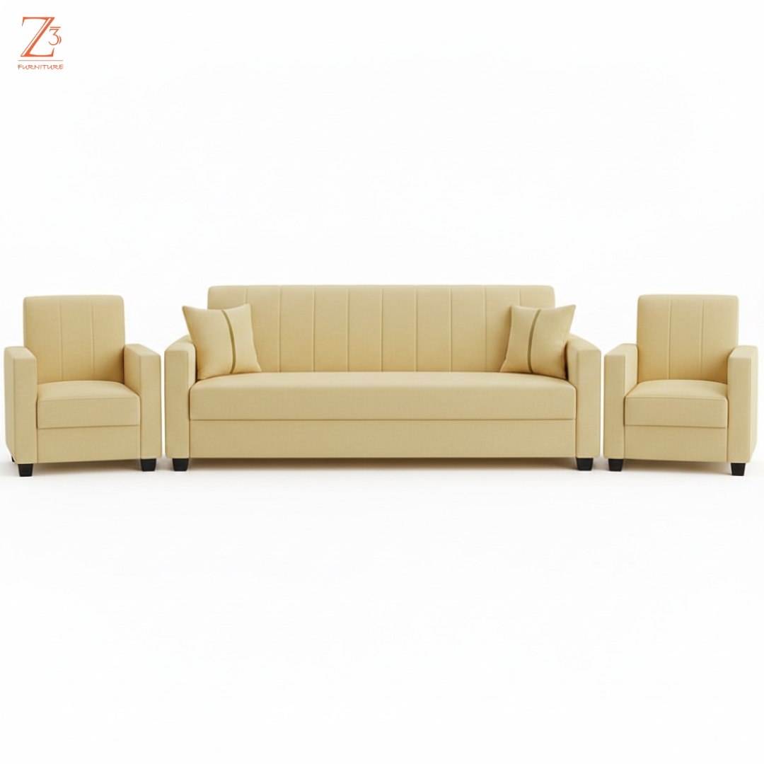 The Z Cube Light Yellow Fabric 3+1+1 Sofa Set is ideal for homeowners who want a stylish yet functional sofa that fits both modern and contemporary interior designs. Its Light Yellow upholstery adds a fresh look to your living room, while the comfort-oriented seat design ensures a relaxed seating experience for family gatherings and guest visits. Thoughtfully engineered with a sturdy wood frame and high-density foam, this set delivers reliable comfort and long-lasting performance for everyday living.