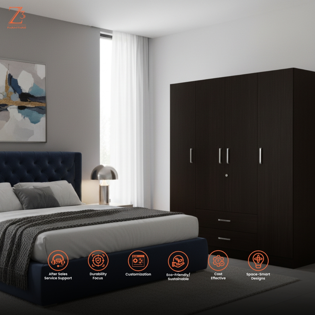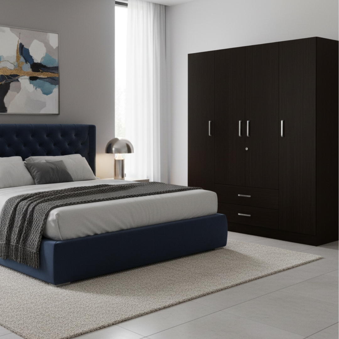 Built for spacious and organized living, this Axispro Four Door Wardrobe by Z Cube Furniture is crafted from durable engineered wood for everyday reliability. It offers 11 shelves, 1 hanging space, and 2 drawers, complemented by flexible shelf space, auto-closing hinges, and a secure lock. The mirror-free design keeps the look clean and modern. Z Cube Furniture is one of the best furniture makers in Mumbai, known for functional design and lasting quality.