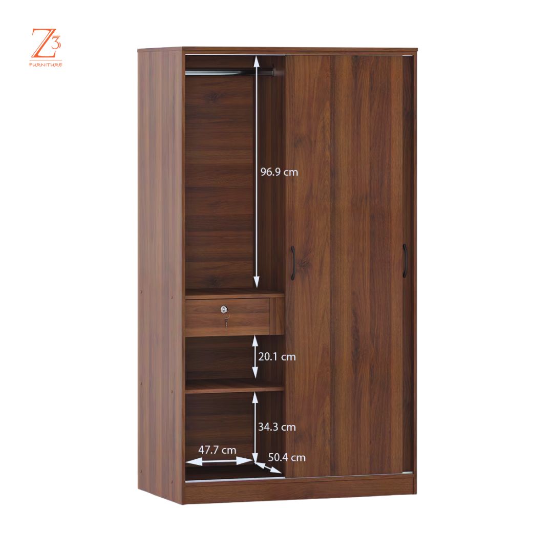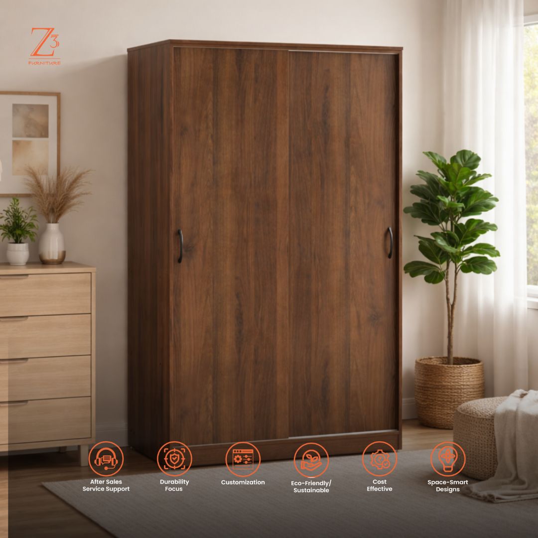 Modern and space-efficient, this sliding Imperial Two Door Wardrobe by Z Cube Furniture is crafted from durable engineered wood for everyday reliability. It features 2 shelves, 2 drawers, and a dedicated hanging space, paired with a smooth sliding door system and secure lock. Designed to maximize storage while saving room space. Z Cube Furniture is one of the best furniture makers in Mumbai, known for smart functionality and lasting quality.