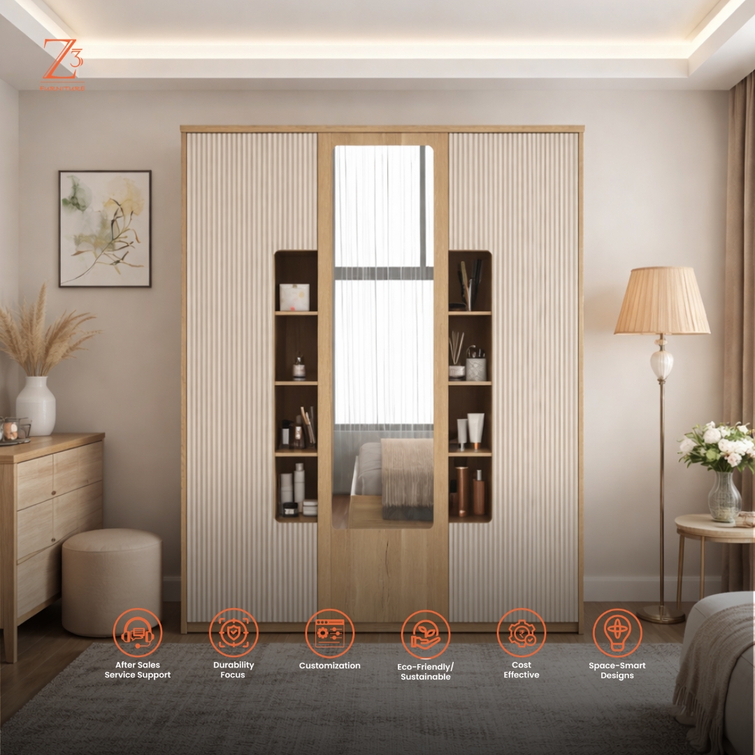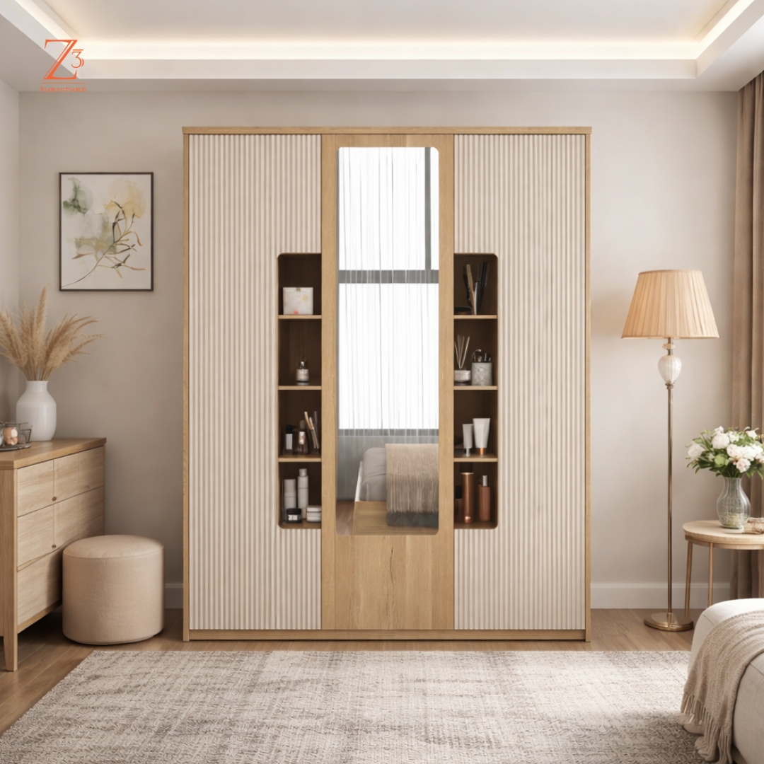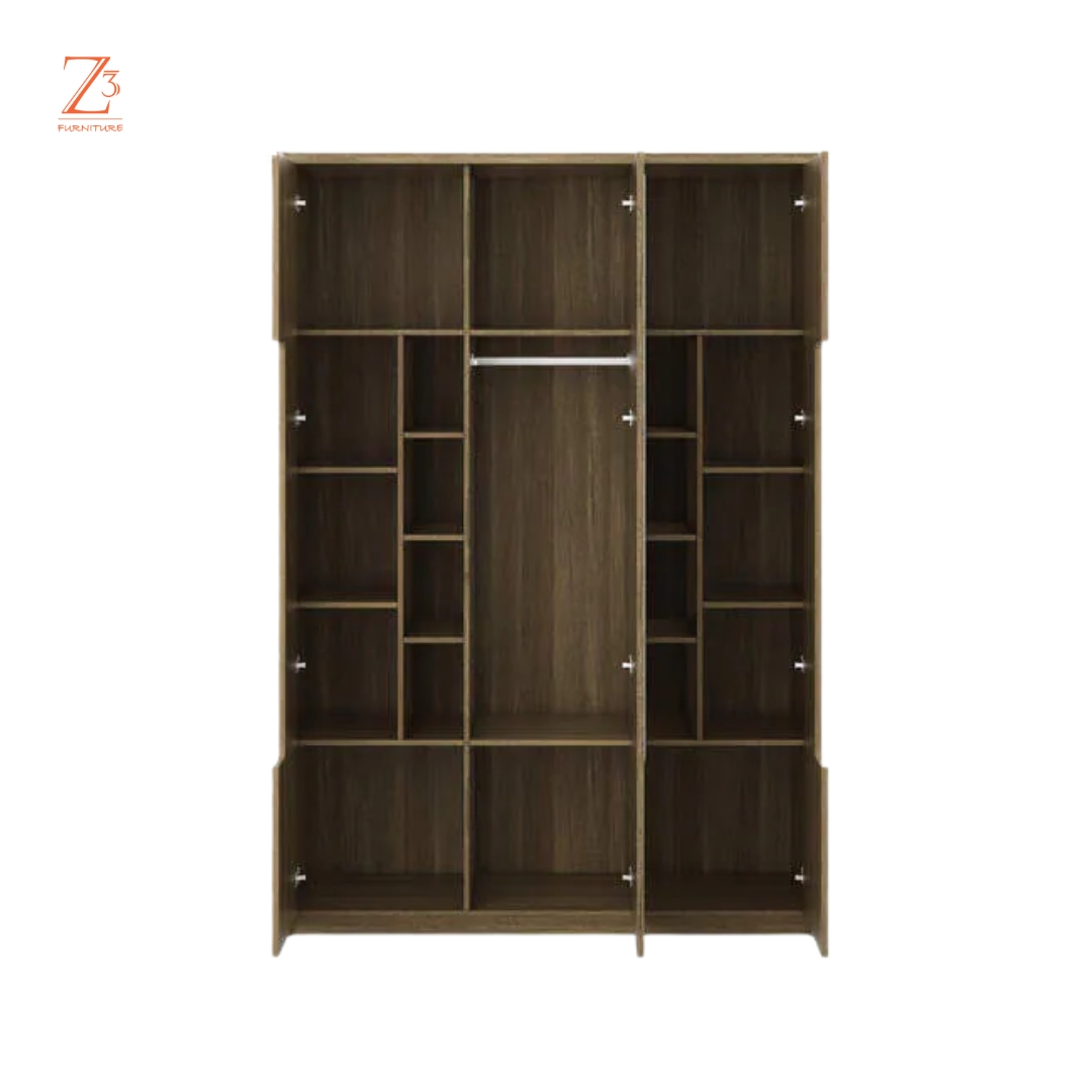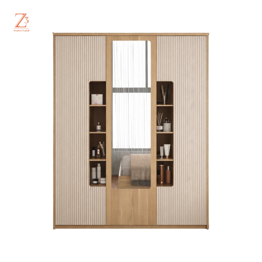 Designed for ultimate organization, this three-door wardrobe features 12 spacious shelves to neatly arrange clothing and essentials, along with a dedicated hanging section for wrinkle-free storage. The integrated mirror adds everyday practicality while enhancing the room’s visual appeal — a perfect blend of capacity, function, and modern style.