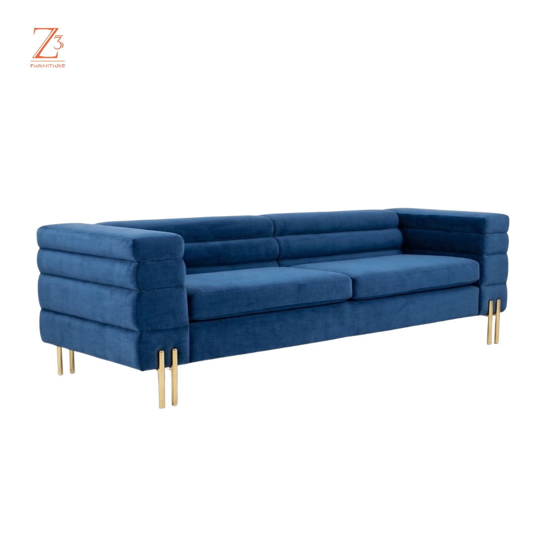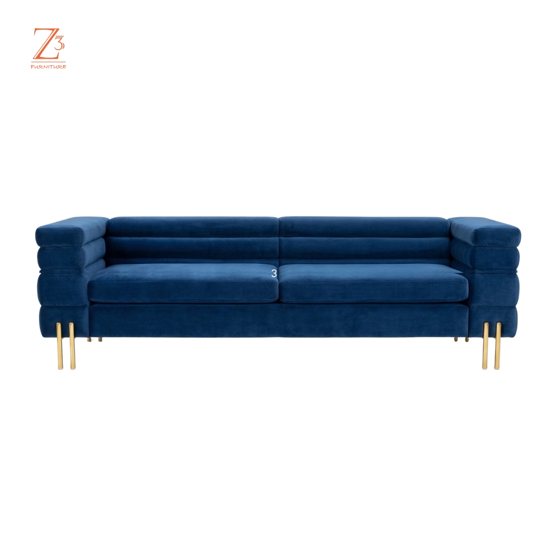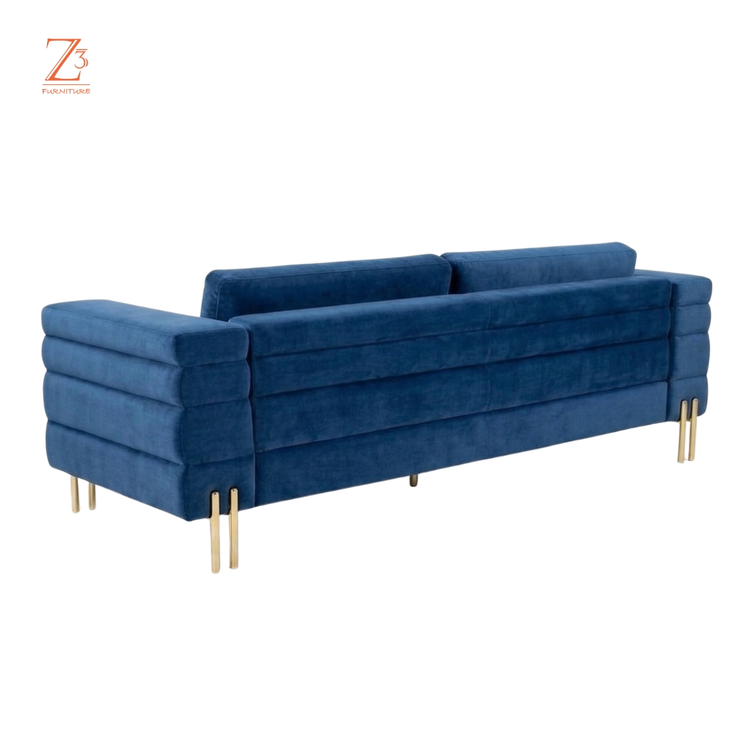 Built with a durable hardwood frame and cushioned with high-density foam, the sofa provides strong structural support and comfortable seating for everyday use. The sleek silhouette is enhanced with elegant SS-PVD gold accents, offering a refined touch that elevates the overall design.