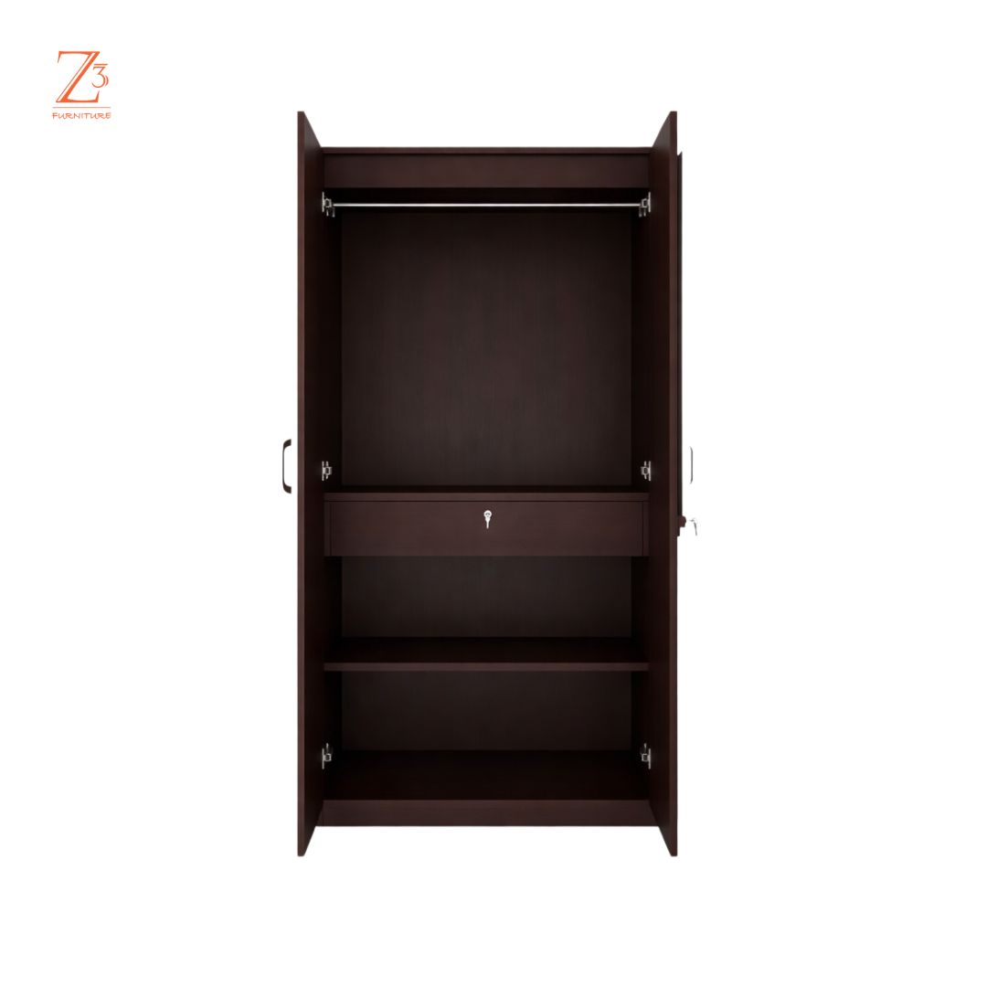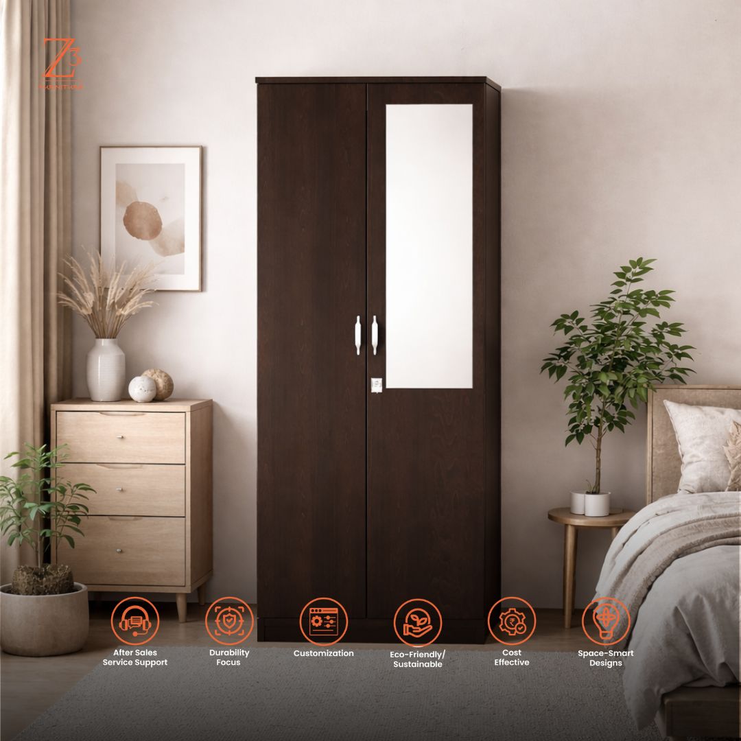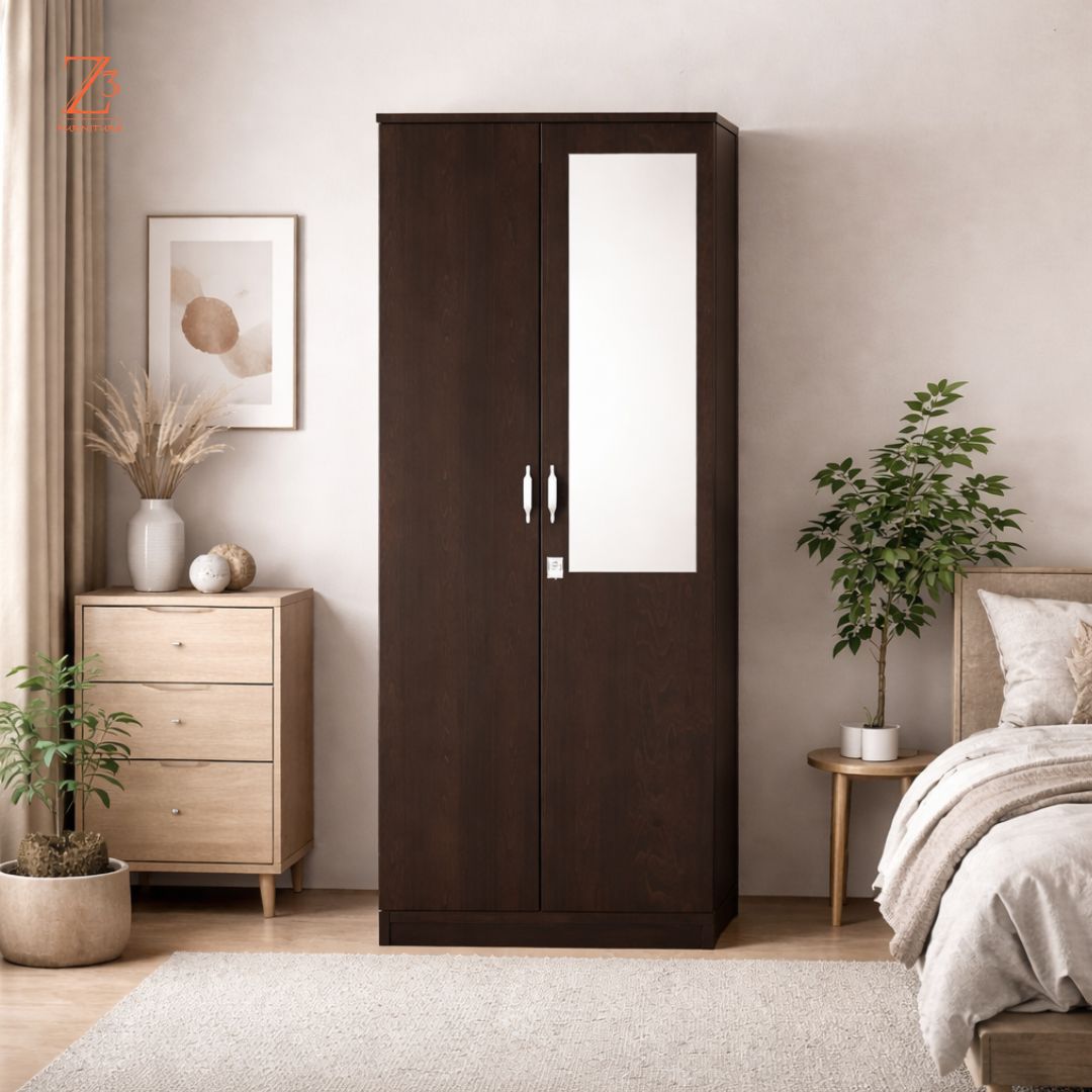Functional and space-smart, this Neo-1 Two Door Wardrobe with mirror by Z Cube Furniture is crafted from durable engineered wood for daily use. It includes 2 shelves, 1 drawer, and a dedicated hanging space, enhanced with auto-closing hinges and a secure lock. The built-in mirror adds convenience while keeping the design sleek. Z Cube Furniture is one of the best furniture makers in Mumbai, known for practical design and lasting quality.