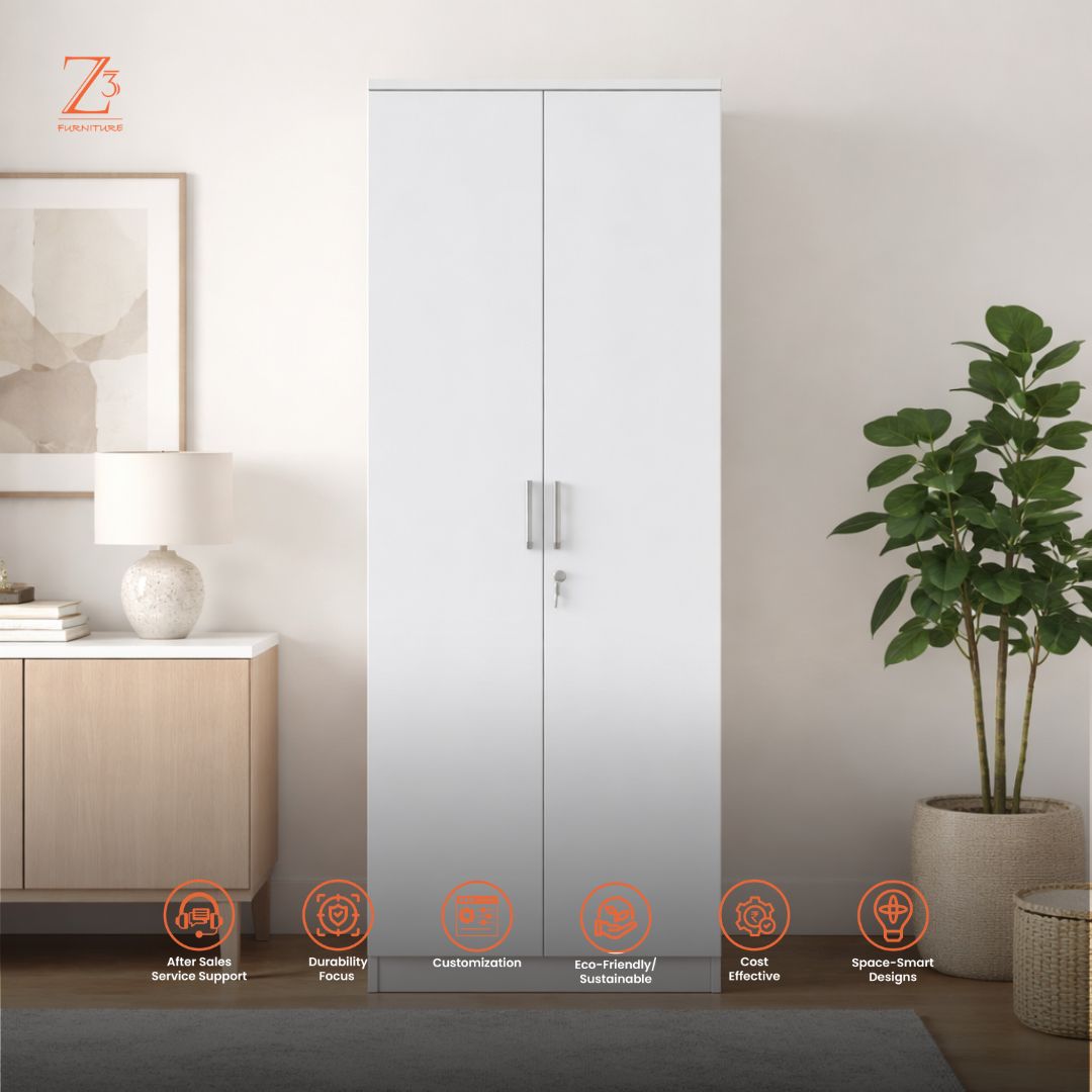 Simple, spacious, and practical, this Neo-3 Two Door Wardrobe by Z Cube Furniture is crafted from durable engineered wood for everyday reliability. With 4 flexible shelves, auto-closing hinges, and a secure lock, it ensures neat and organized storage. The clean design blends effortlessly into modern bedrooms. Z Cube Furniture is one of the best furniture makers in Mumbai, known for smart functionality and lasting quality.