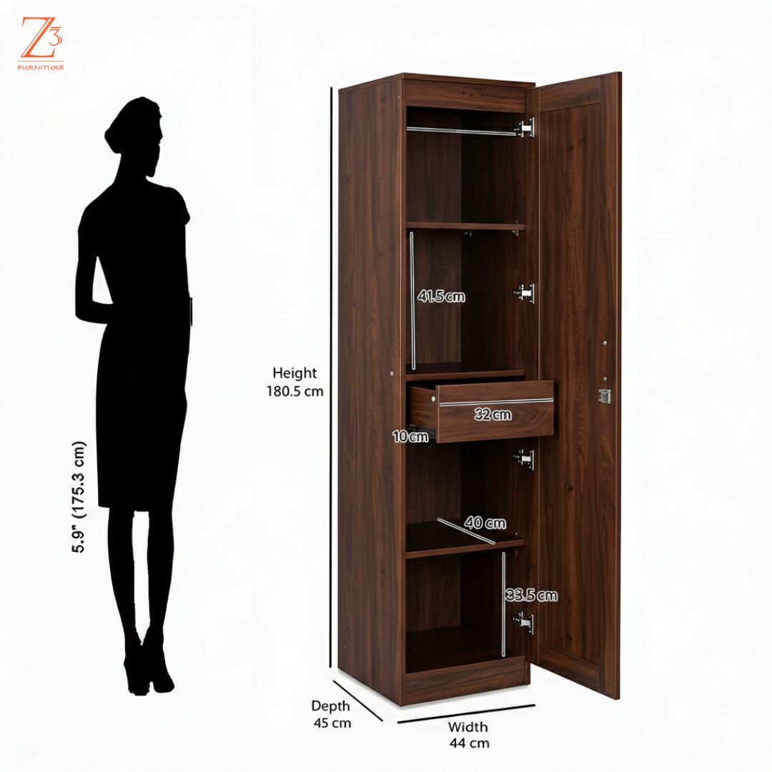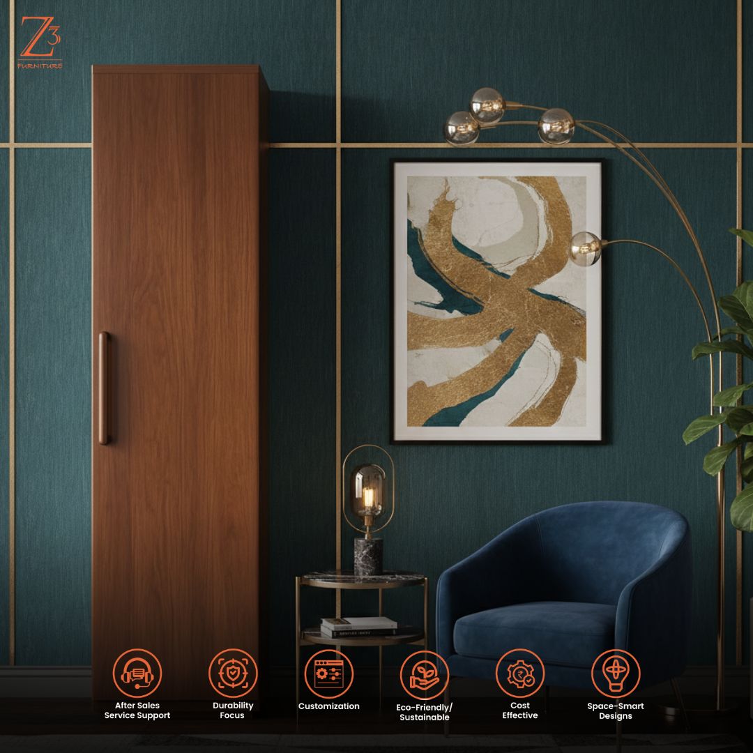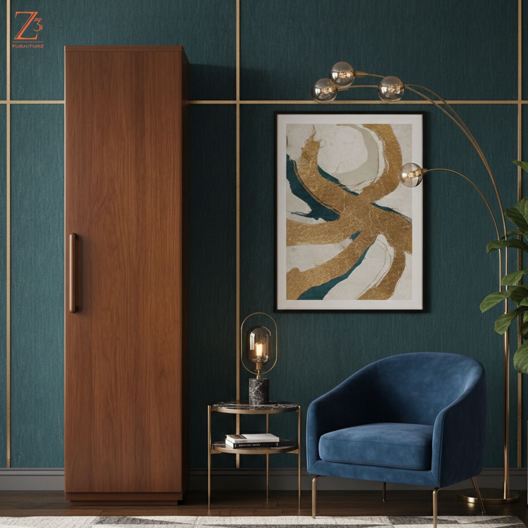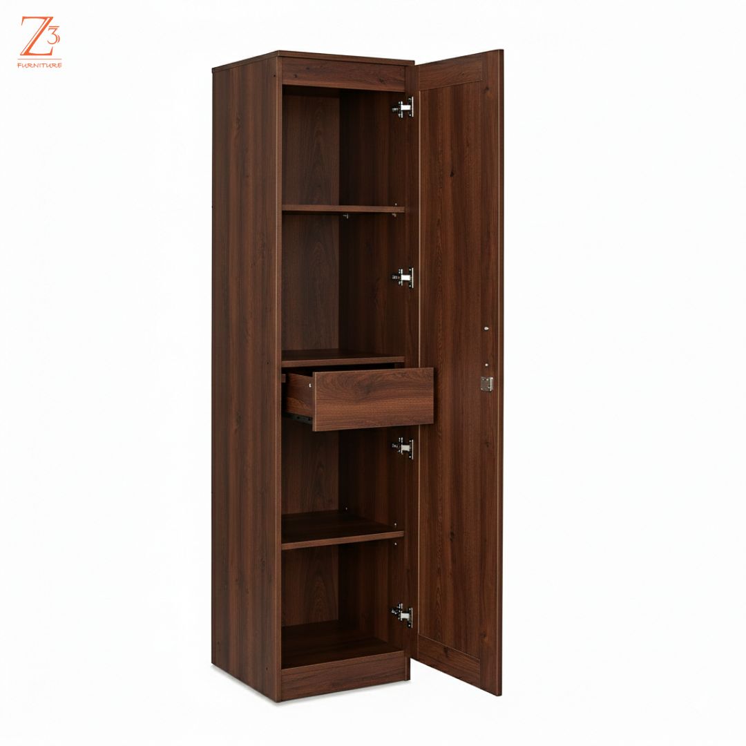 Simple, sturdy, and space-efficient, this one-door wardrobe by Z Cube Furniture is made from high-quality engineered wood for daily durability. With 4 shelves and 1 drawer, it offers flexible storage along with auto-closing hinges and a secure lock. Its slim design fits effortlessly into modern bedrooms. Z Cube Furniture is one of the best furniture makers in Mumbai, trusted for smart design and lasting quality.