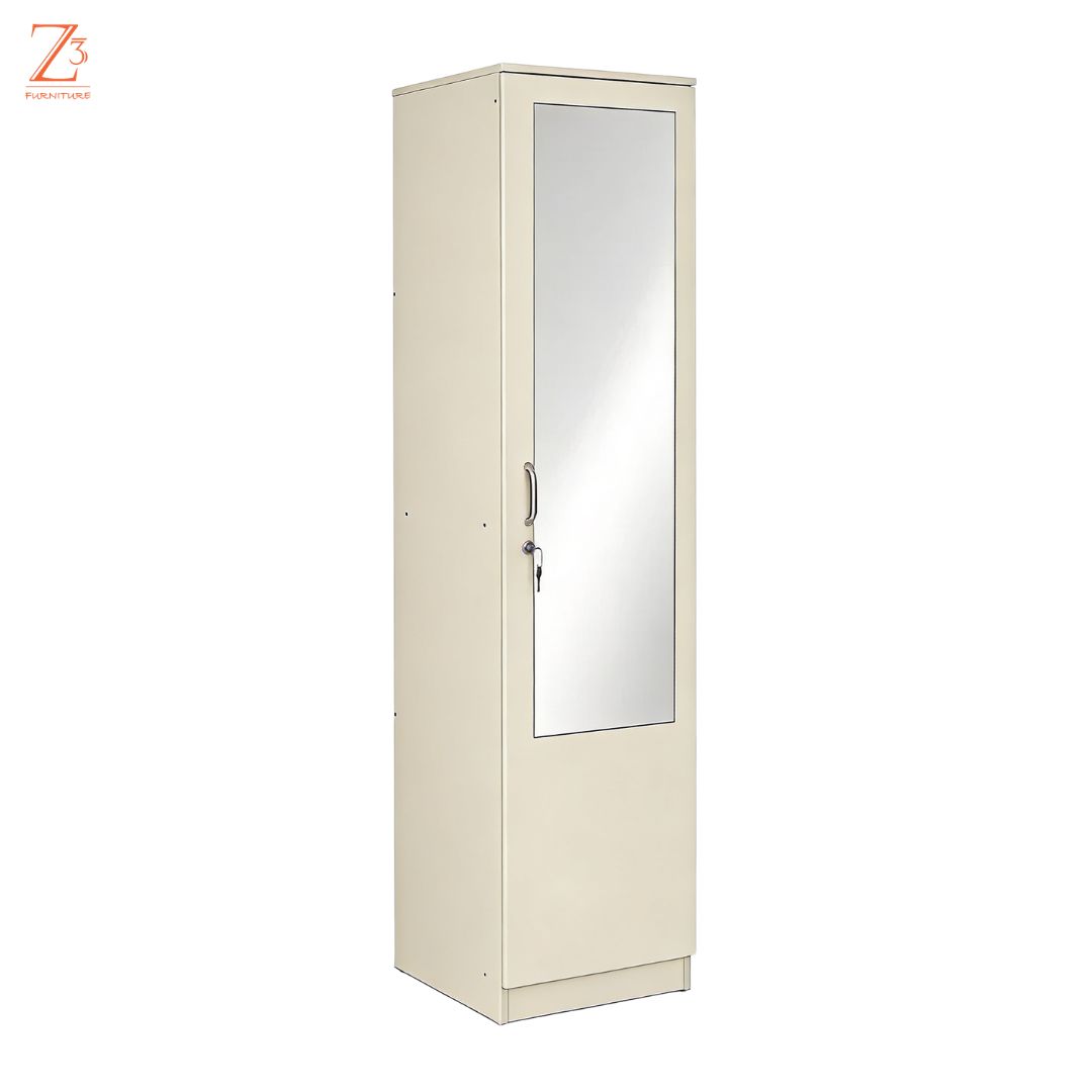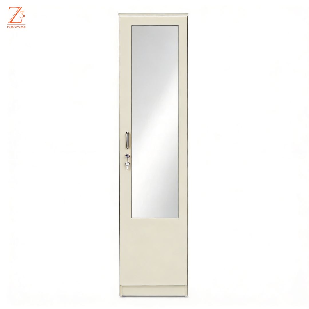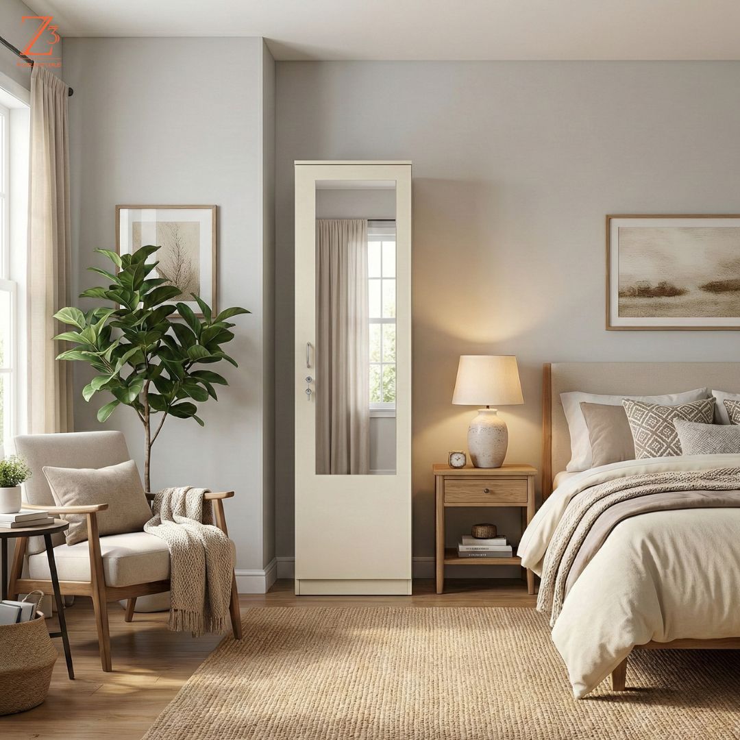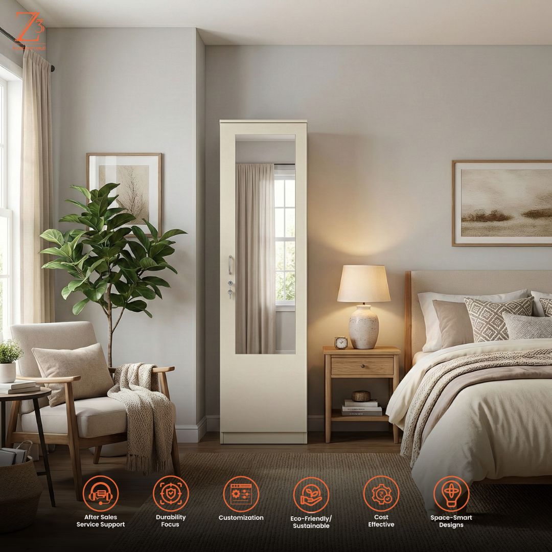 Smart and compact, this one-door wardrobe with mirror by Z Cube Furniture is made from durable engineered wood and designed for everyday use. It comes with 4 shelves and 1 drawer, offering flexible storage along with auto-closing hinges and a secure lock. The slim design is ideal for modern, space-conscious homes. Z Cube Furniture is one of the best furniture makers in Mumbai, known for clean design and dependable quality.