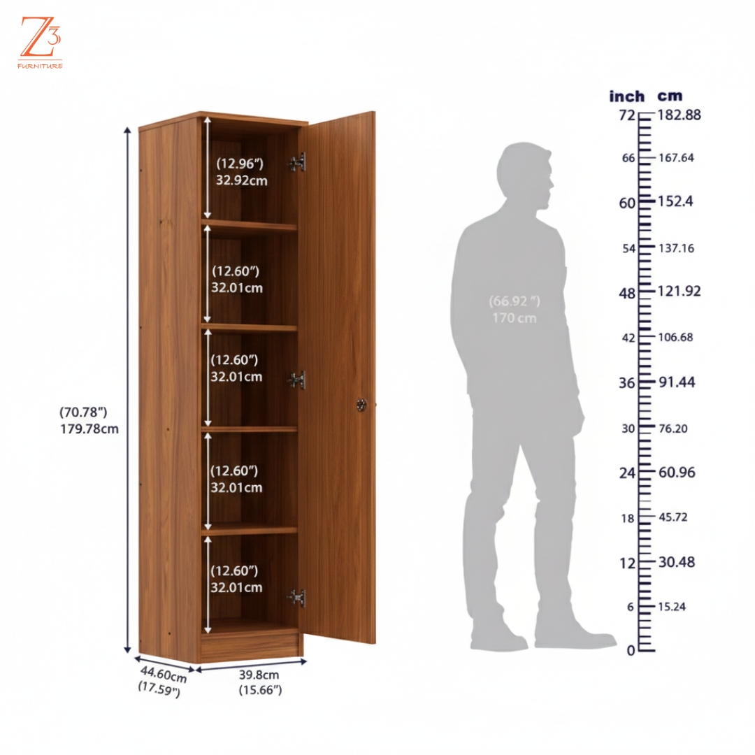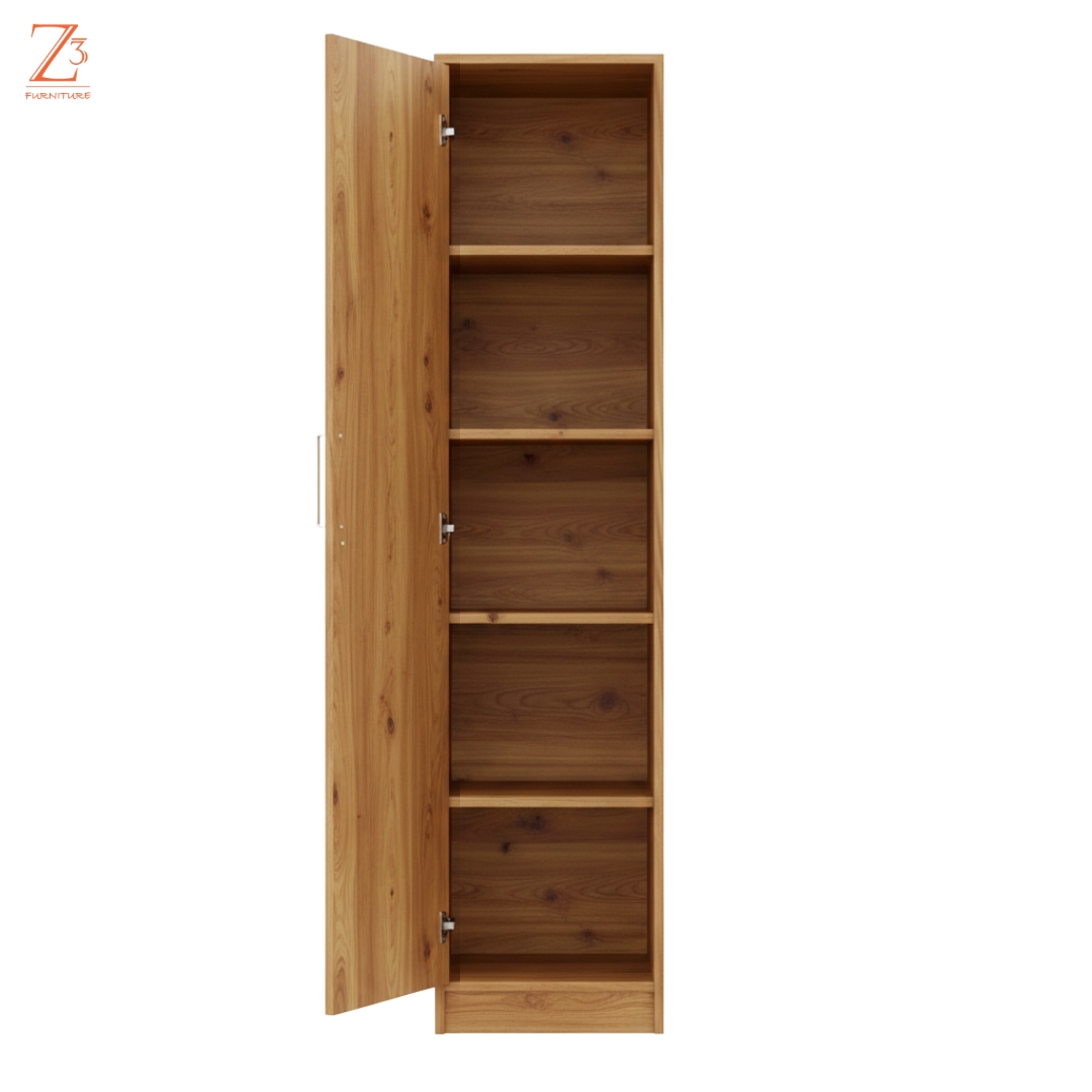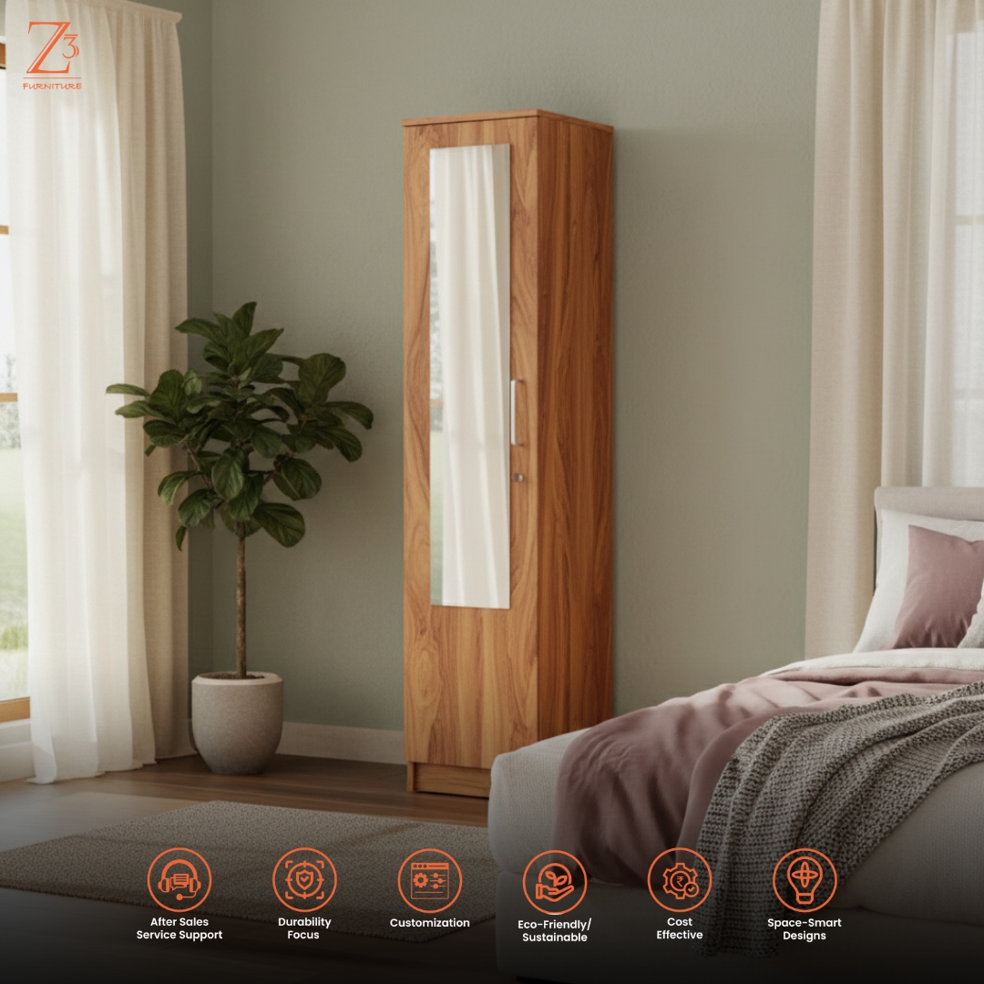Smart and compact, this one-door wardrobe with mirror by Z Cube Furniture is made from durable engineered wood and designed for everyday use. It comes with 5 shelves, offering flexible storage along with auto-closing hinges and a secure lock. The slim design is ideal for modern, space-conscious homes. Z Cube Furniture is one of the best furniture makers in Mumbai, known for clean design and dependable quality.