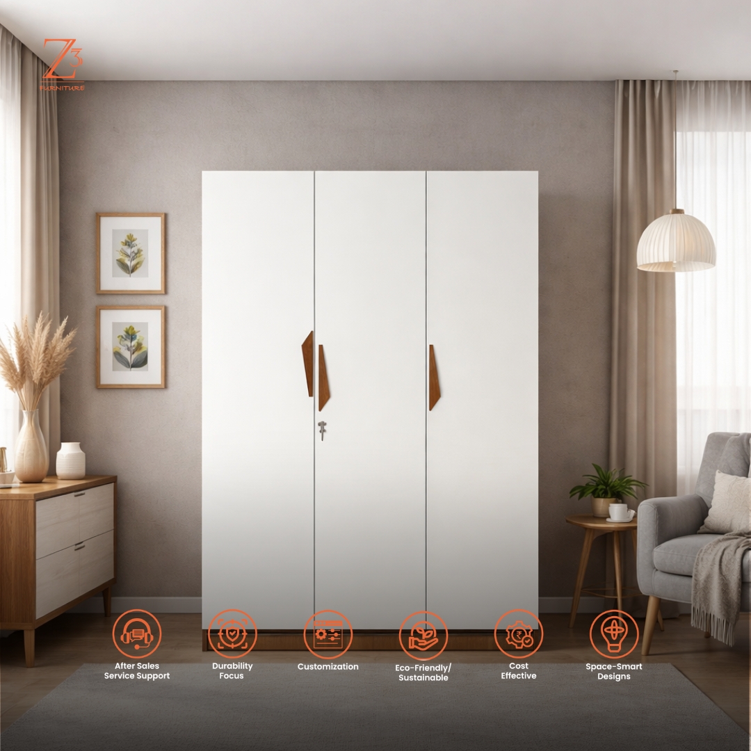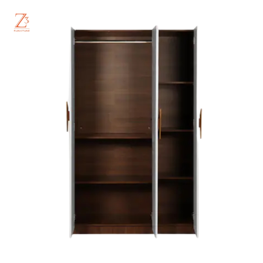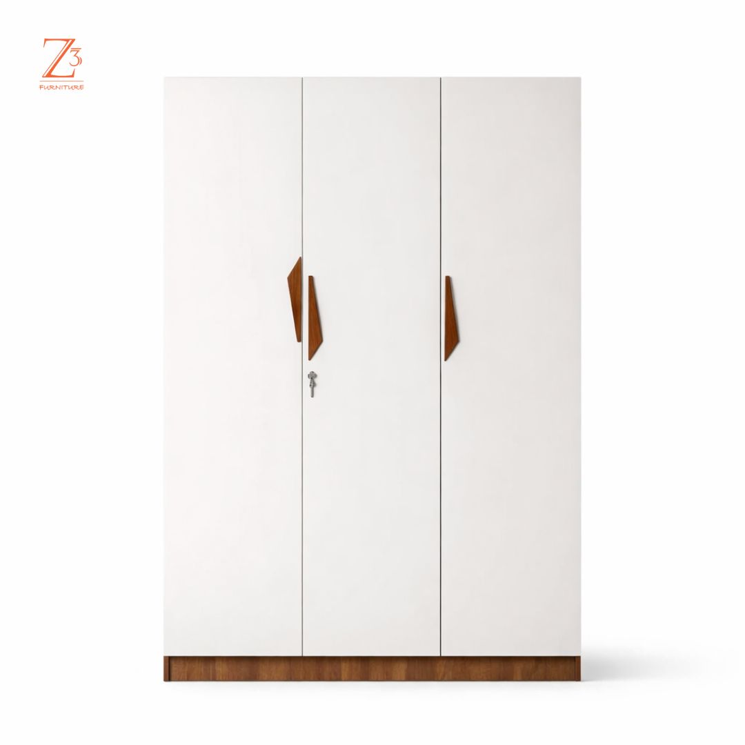Stylish and spacious, this Opus-1 Three Door Wardrobe by Z Cube Furniture features a modern Teak & White finish crafted on durable engineered wood. Designed with 6 shelves and a dedicated hanging space, it includes auto-closing hinges and a secure