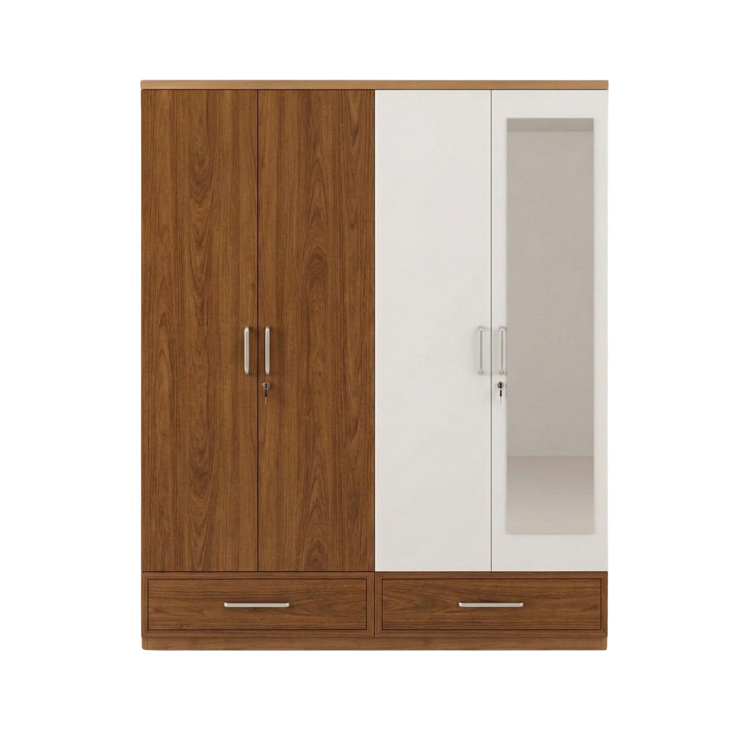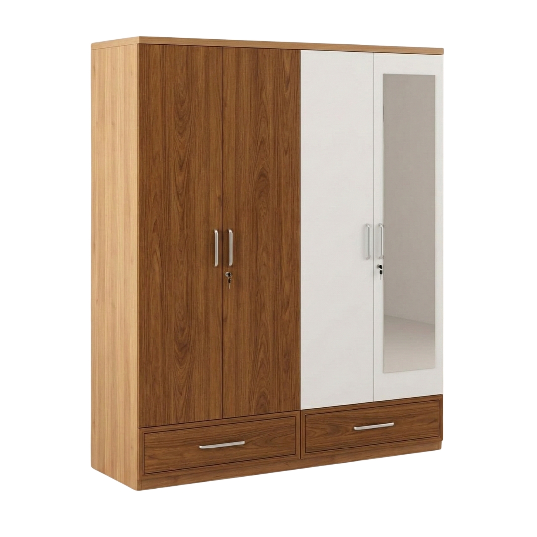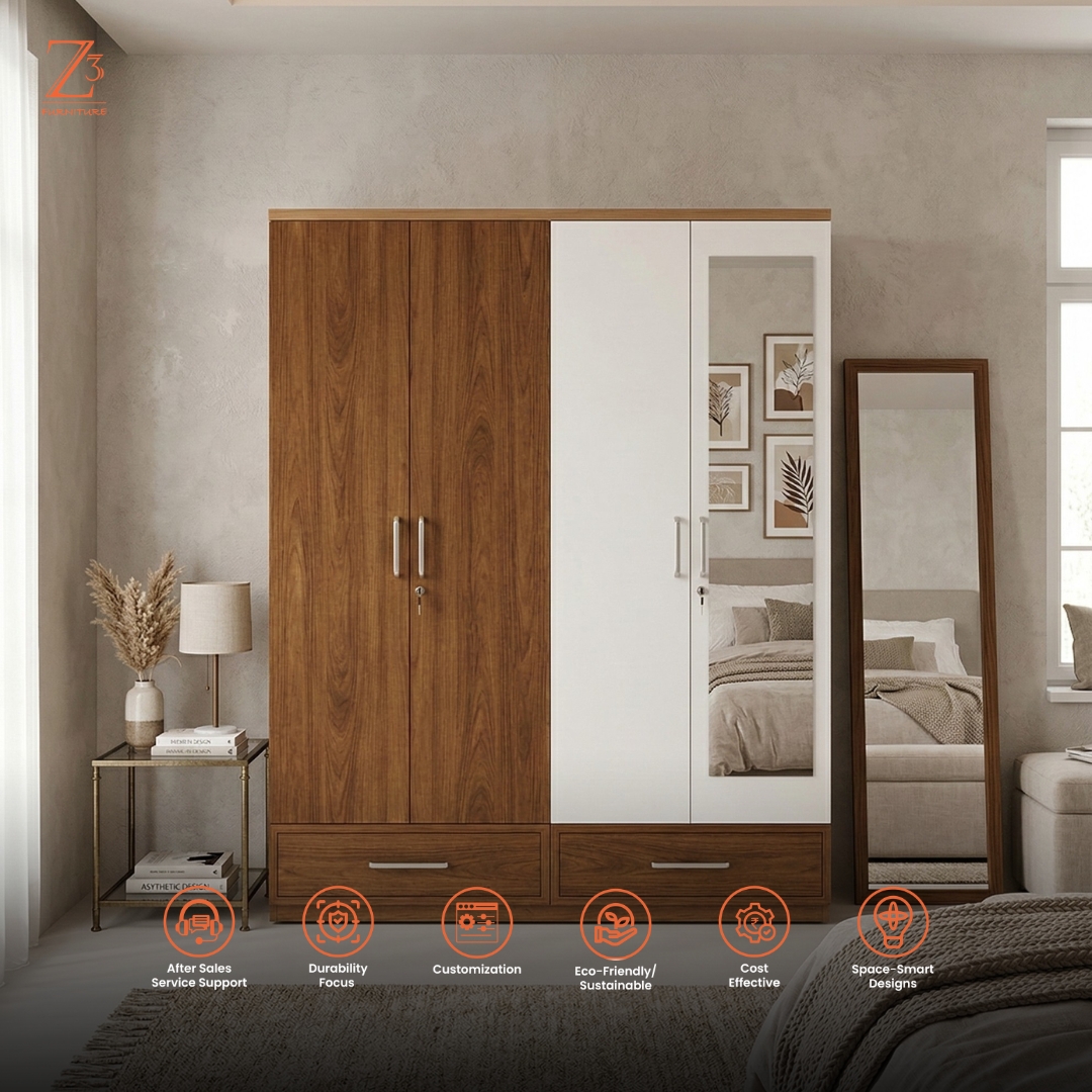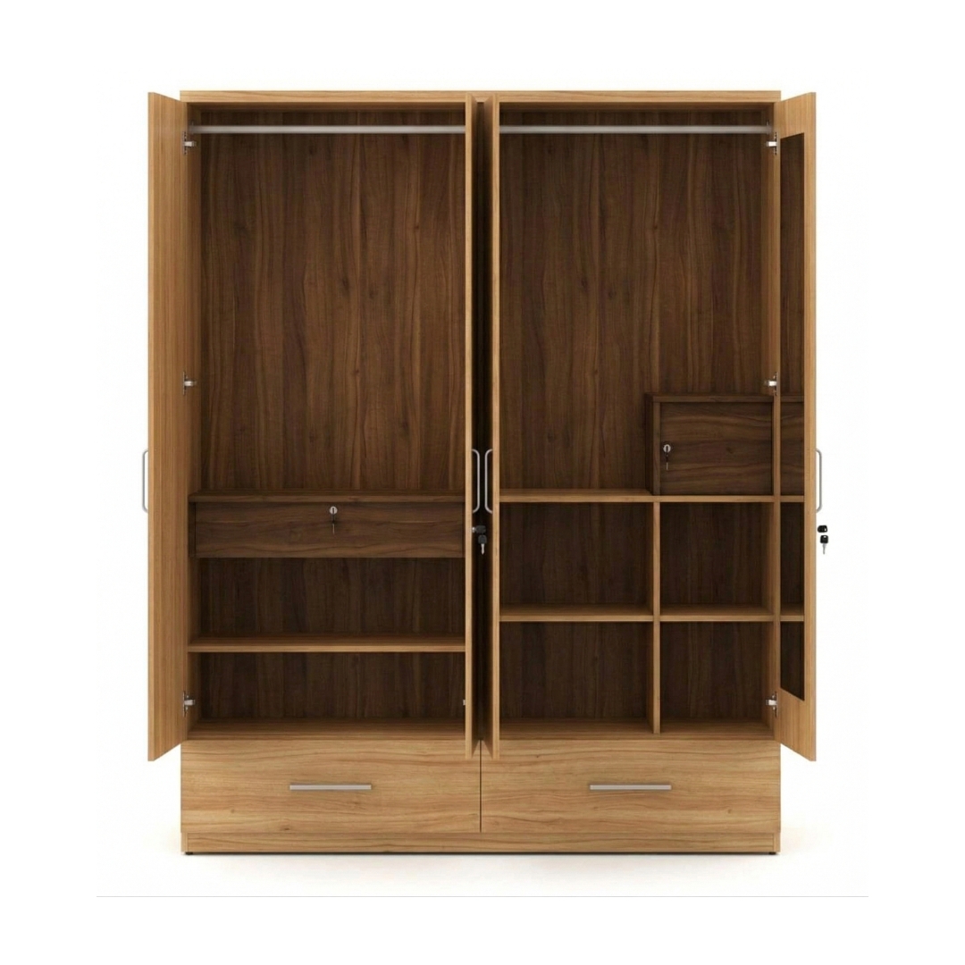Built for organized and spacious storage, this Spacemax Four Door Wardrobe with mirror by Z Cube Furniture is crafted from durable engineered wood for everyday reliability. It features 6 shelves, 1 hanging space, 3 drawers, and 1 locker, along with flexible shelf space, auto-closing hinges, and a secure lock. The built-in mirror enhances functionality while complementing modern interiors. Z Cube Furniture is one of the best furniture makers in Mumbai, known for smart layouts and lasting quality.