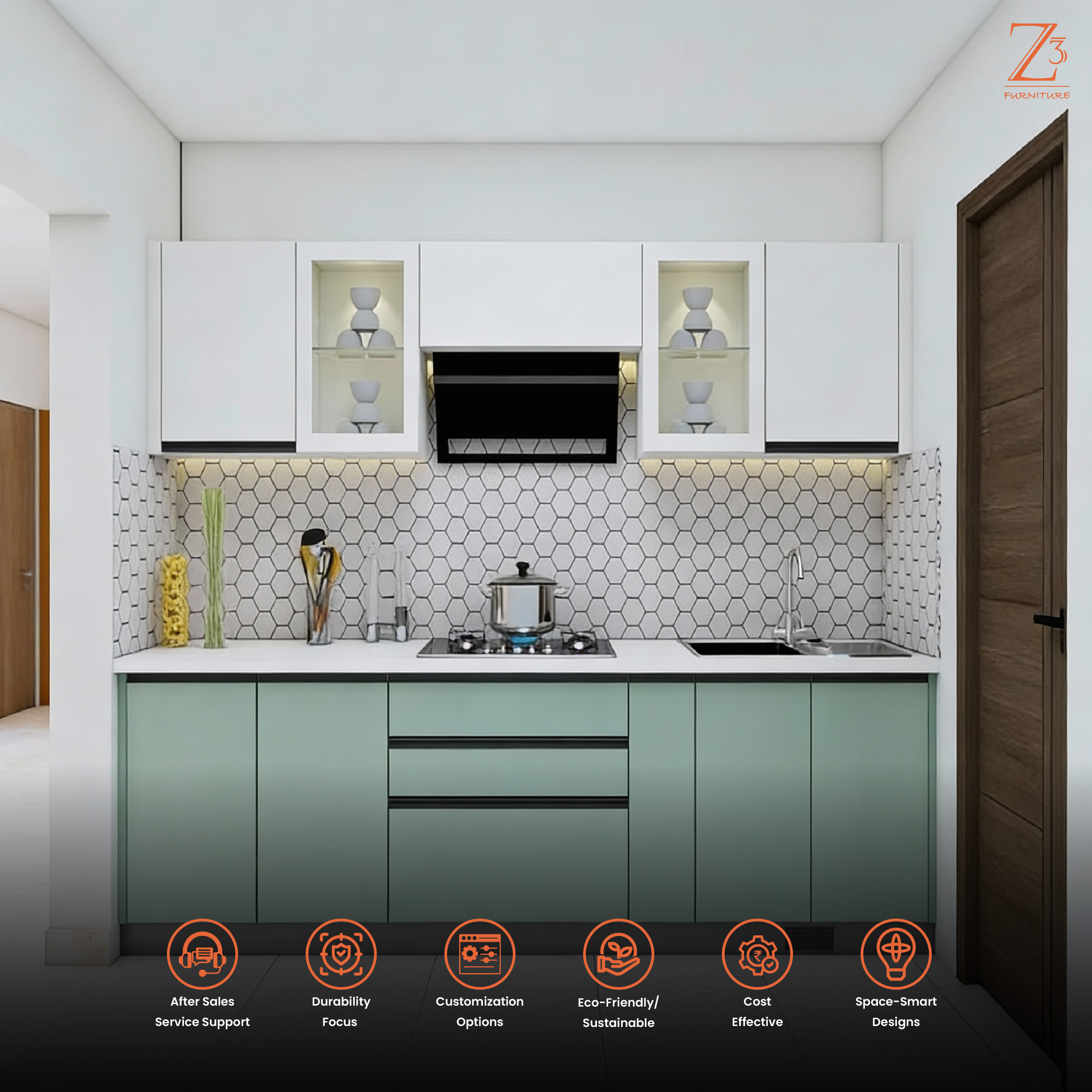 At ZCube Furniture, we combine innovation with practicality. Our straight kitchen designs are crafted using the latest wood-cutting technology, ensuring precision and durability. Each piece is tailored to fit your space seamlessly, making it easy to assemble and install on-site.