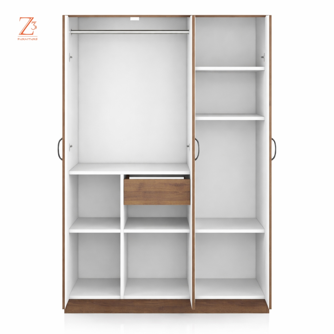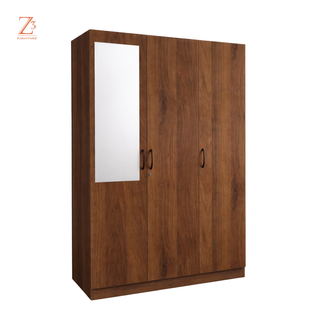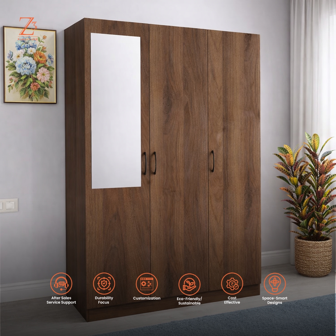 Generous and intelligently crafted, this Zenith-1 Three Door Wardrobe with mirror by Z Cube Furniture is built from durable engineered wood for dependable daily use. With 8 shelves, 1 drawer, and a dedicated hanging section, plus auto-closing hinges and a secure lock, it ensures seamless organization. The integrated mirror boosts practicality while elevating the contemporary design.